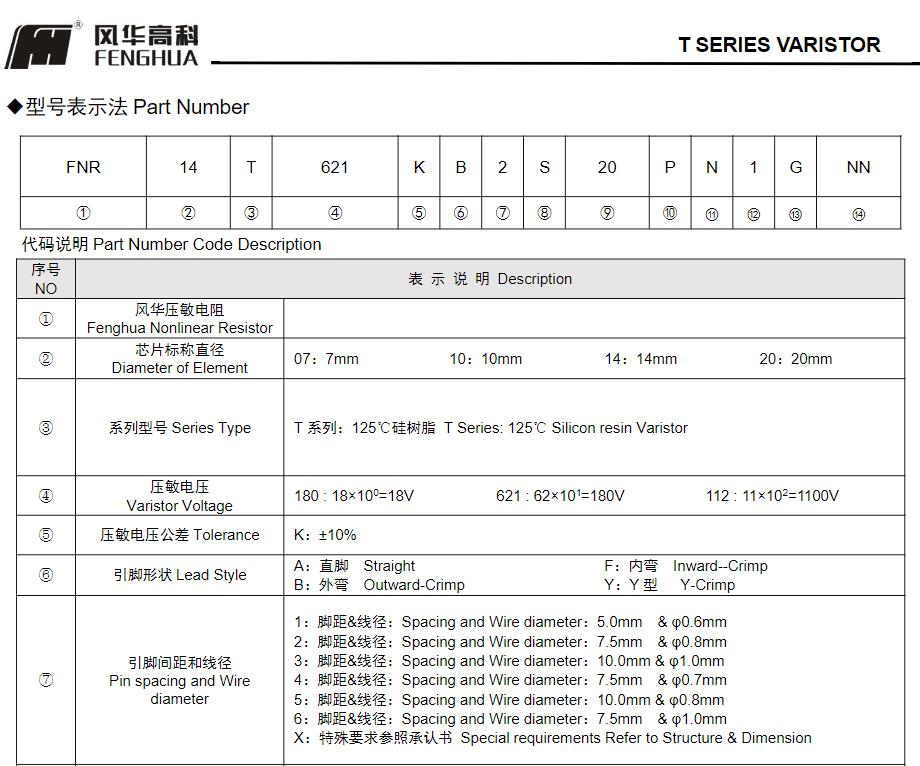 風(fēng)華高科T系列壓敏電阻器型號(hào)命名規(guī)則: