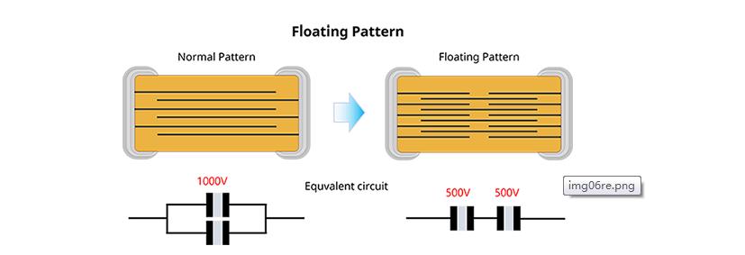 Floating設(shè)計(jì)雖然是在MLCC 發(fā)生Crack時(shí),能夠降低短路風(fēng)險(xiǎn)的結(jié)構(gòu),但是在高電壓下也是非常有用的結(jié)構(gòu)。Floating 結(jié)構(gòu)在MLCC內(nèi)部將電壓按一半分配。例如在MLCC兩端施加1000V電壓時(shí),利用Floating設(shè)計(jì)可將MLCC電介質(zhì)內(nèi)部的電壓降低到1000V的一半,也就是500V。因?yàn)镸LCC的壽命由溫度和電壓決定,而施加在MLCC電介質(zhì)上的Electric field變?nèi)酰栽诳煽啃苑矫姹阌辛藘?yōu)勢(shì)。