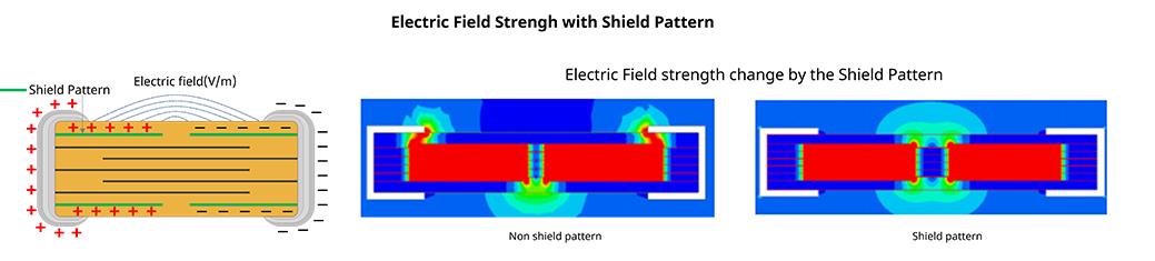 高壓MLCC結(jié)構(gòu)與一般MLCC 相比有何不同呢?在高電壓環(huán)境下需要確保可靠性。暴露在高壓環(huán)境下的MLCC有Arc-ove的危險(xiǎn),MLCC內(nèi)部存在短路的危險(xiǎn)。當(dāng)向MLCC施加高電壓時(shí),MLCC周圍會(huì)形成強(qiáng)電場(chǎng)(Electric field),進(jìn)而產(chǎn)生ionized air。尤其是在MLCC端電極部位集中了大的電場(chǎng)(Electric field)。如果在Ionized air中超過了啟動(dòng)電壓(inception voltage)就會(huì)發(fā)生電 Arc,MLCC 內(nèi)部就會(huì)有發(fā)生circuit short 的危險(xiǎn)。防止這種現(xiàn)象產(chǎn)生的結(jié)構(gòu)是shield pattern。